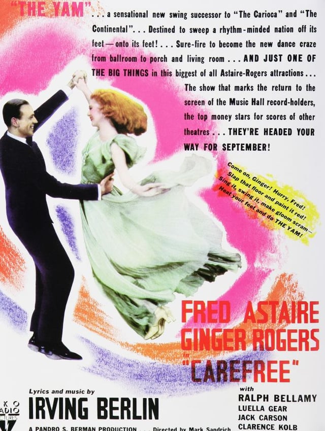 The ad for the film fits its tone extremely well, with a happy, dancing couple surrounded by swirling patches of bright pink, yellow, and orange. This colorful arrangement, especially in its use of adjacent pastels, would actually come back into fashion in the advertisements of the 1990s. The film's stars -- Fred Astaire and Ginger Rogers -- were among the biggest draws of the era, starring in 10 films together from 1933 to 1949. In an era when financial security was lacking for a majority of the movie-going audience, films such as Carefree (and the accompanying advertisements) provided a welcome escape.