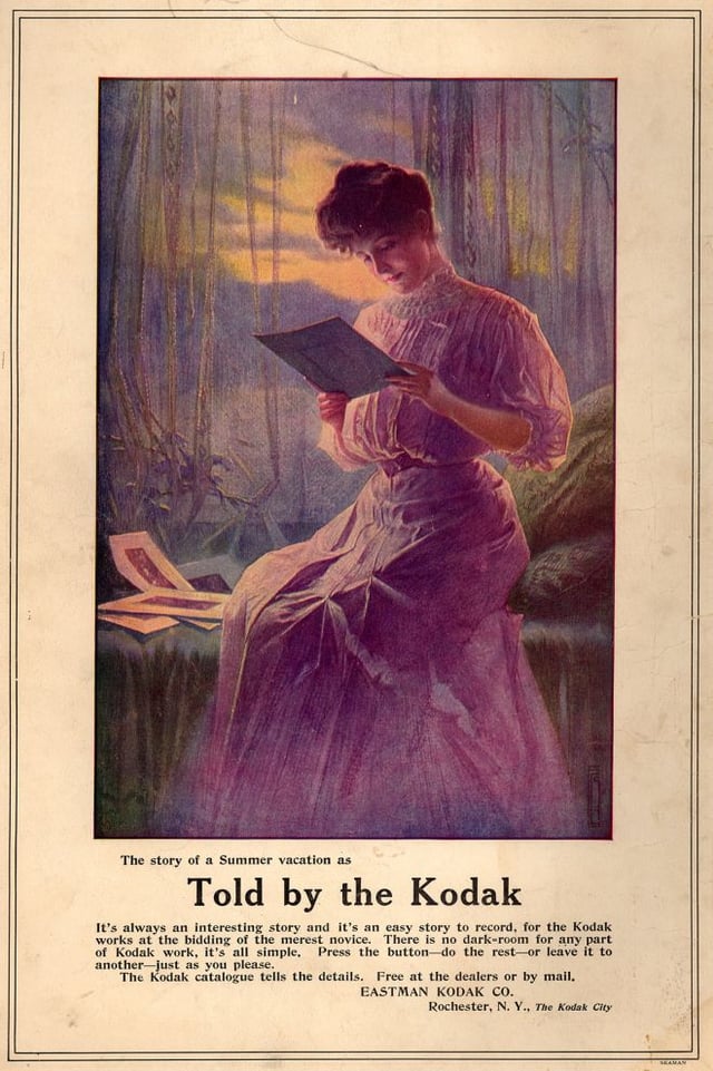 While the model¡¯s hair and fashion choices betray the ad¡¯s century-old status, the concept could apply to a magazine ad today. She is contentedly going over the stunningly mounted prints that she took with her Kodak. The background is accented by a beautifully somber twilight scene, which gives the viewer an idea of what her photographic subjects might have been. Another connection to today¡¯s modern marketing is the call-to-action at the end of the ad: ¡°The Kodak catalogue tells the details. Free at the dealers or by mail.¡±