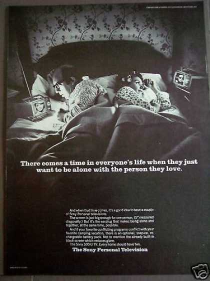 In this Sony advertisement from 1968, a couple is shown lying down in bed, each facing the opposite direction and glaring into their own personal televisions. The humor isn¡¯t missed on the makers of the ad, with the caption reading: ¡°There comes a time in everyone¡¯s life when they just want to be alone with the person they love.¡±
