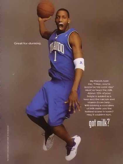 As compared to the Absolut ad, it provides a perfect counterexample in terms of audience. Here the advertisers are targeting adolescents; they want to strip milk of its old, lame connotations and repurpose it as a cool drinking option for kids who want to grow up to be like their heroes. Aesthetically, it couldn¡¯t be more different from the classic illustration of the Absolut ad. NBA legend Tracy McGrady is seen mid-flight against a black and gray background (reminiscent of high school yearbook backgrounds), ready to finish one of his trademark slam dunks into an unseen net.