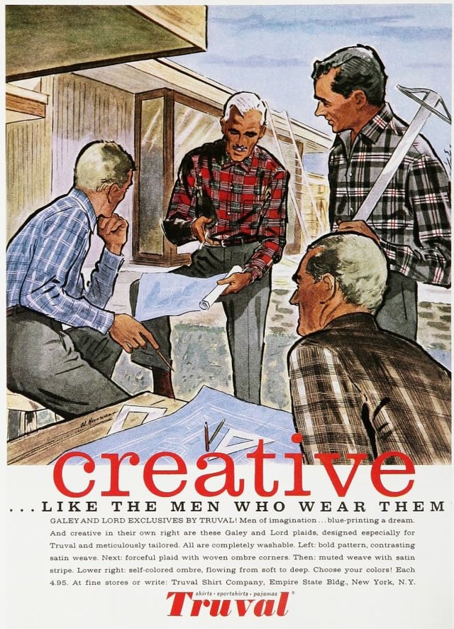The men in the ad are all donning colored plaid shirts, seemingly both comfortable and durable. They appear to be architects and/or engineers, standing around blueprints discussing the best way to get some kind of building job done. The copy reinforces these themes of strength and resourcefulness: ¡°Creative ¡ like the men who wear them.¡±