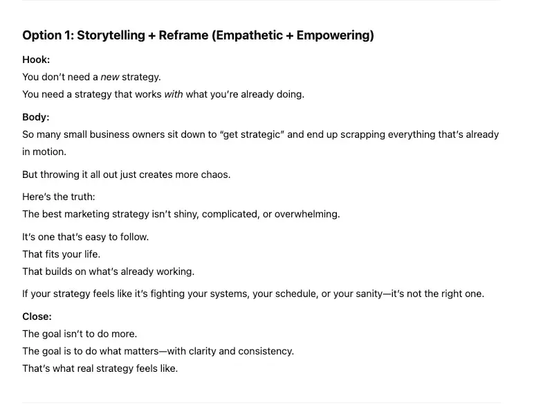 - He prompted Claude again to make the examples specific to messaging strategy, website copy, and consulting businesses.