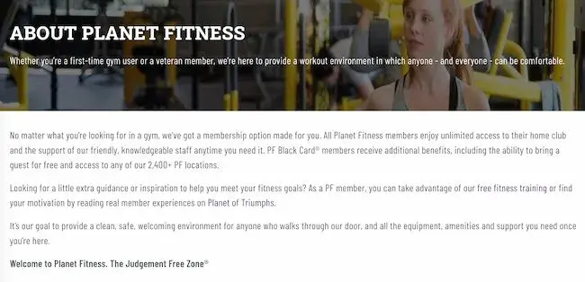 For instance, is based on people's reluctance to join the gym for fear of judgment and embarrassment. The Planet Fitness brand promises to create an environment that encourages people at all fitness levels to go to the gym and feel comfortable working out.