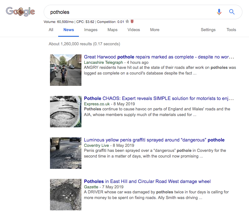 To do this, fire up Google, type in your topic (potholes), and navigate to the News tab: