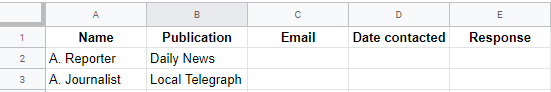 A simple spreadsheet with the journalist's name and the publication they write for is an excellent way to keep a log of your distribution plan: