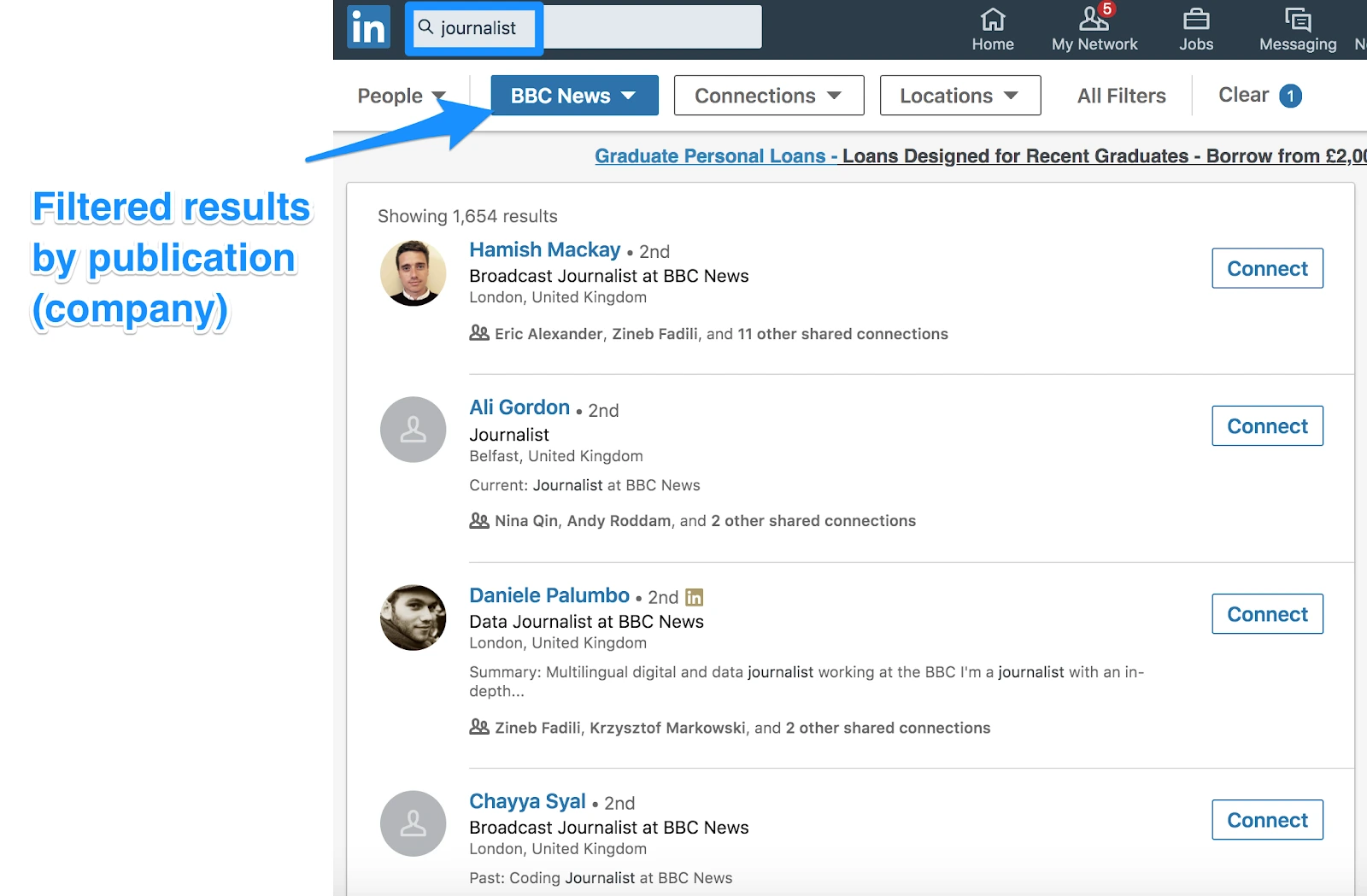 Simply search for ¡°journalist¡± and filter the results by selecting your target publication as ¡°company,¡± then plug their name into to find their email address:
