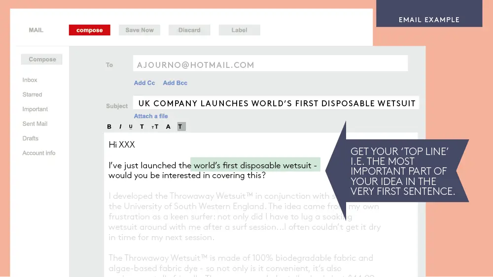 Journalists are time-poor, so they'll appreciate a nice, concise message that sells your story in a few words ¨C like this: