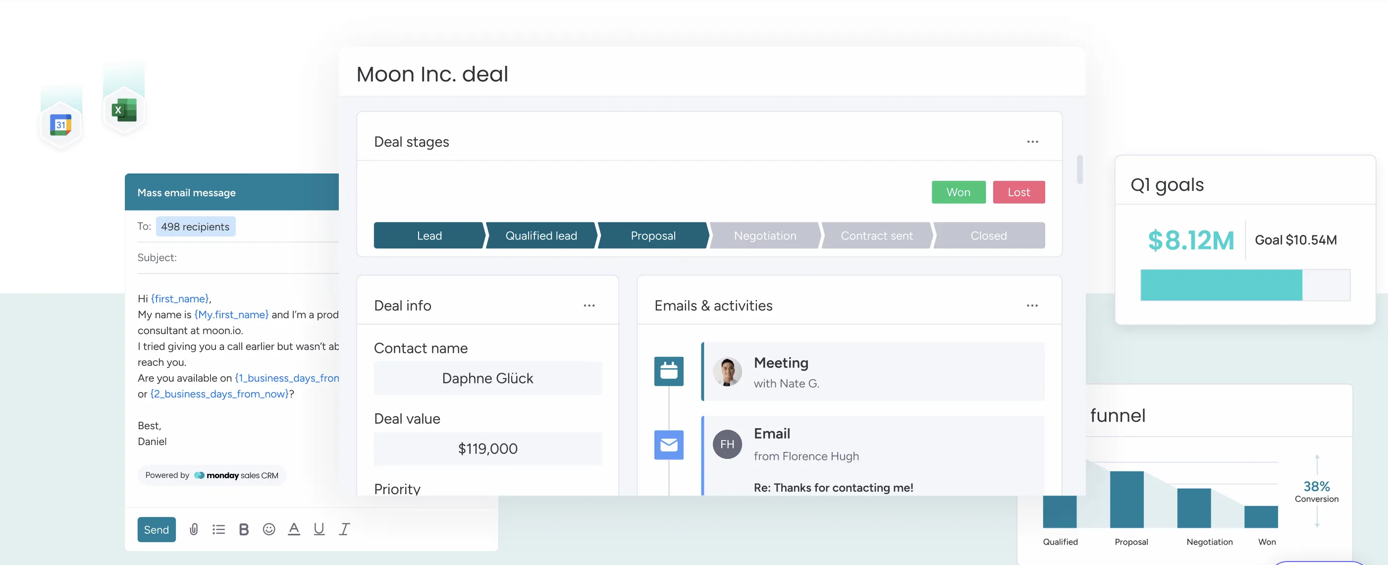 Are you a visual person? Monday Sales CRM lets you drag and drop prospects from stage to stage and view your pipeline at a colorful glance. Designed for sales first, you¡¯ll know exactly where you stand with funnel charts and deal forecasting.