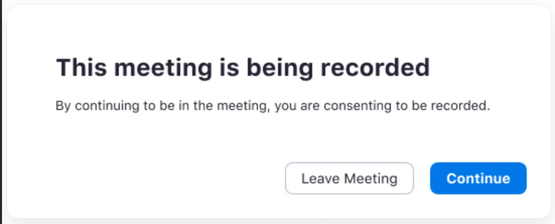 Zoom provides an excellent example of permissions made very clear regarding their recording software. Every participant is issued a pop-up in a recorded meeting as soon as the recording begins. The participant is given an opportunity to continue with the recording or to leave the meeting.