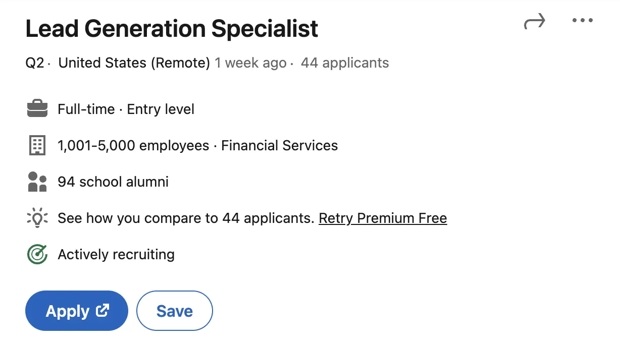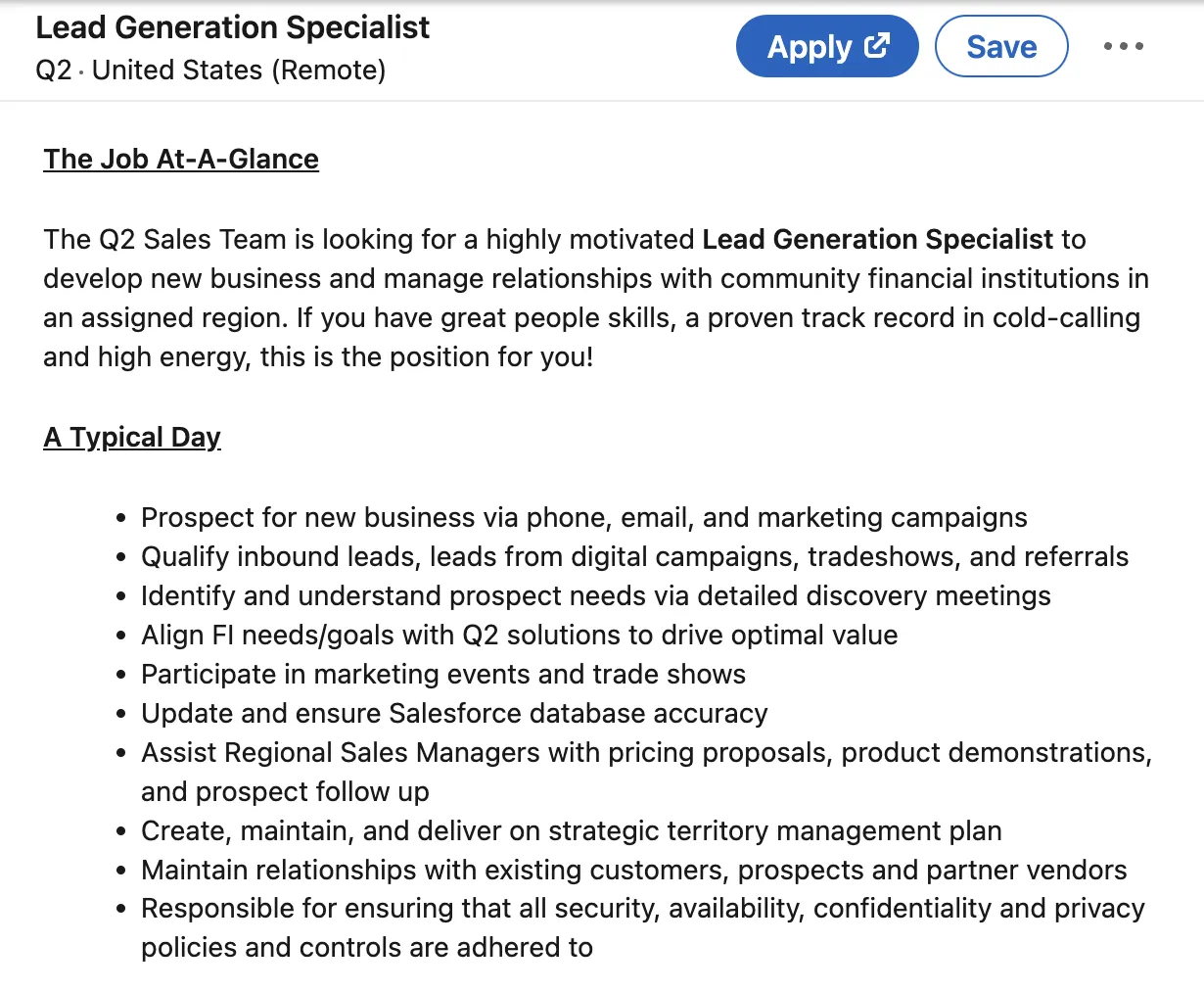 To see what a typical day in the life of a lead generation specialist looks like, let¡¯s take a look at a real job listing for a lead generation specialist on the sales team at financial software company Q2.