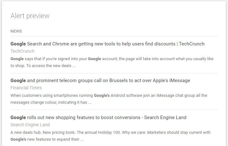 Once you type in your term, Google will show you some search results of recent articles and/or web pages indexed with those keywords or that company¡®s name. This gives you a preview of the type of content you¡¯ll receive via email based on this alert.