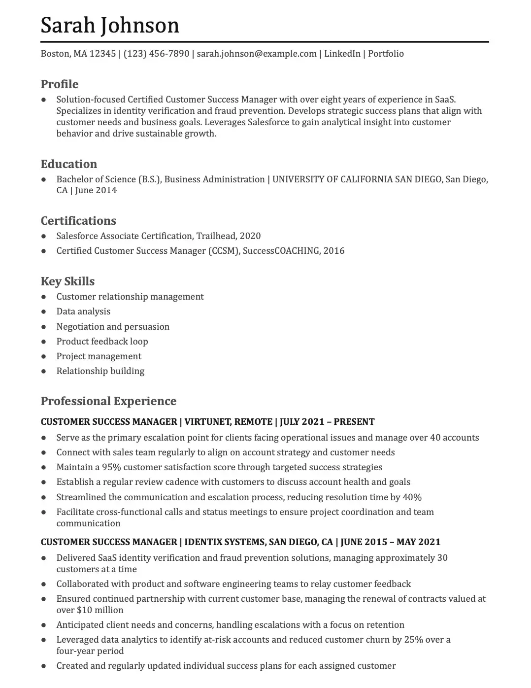 A CSM guides customers from the sales process to the support stage. To get hired as a CSM, your job starts right away with crafting a compelling customer success manager resume.