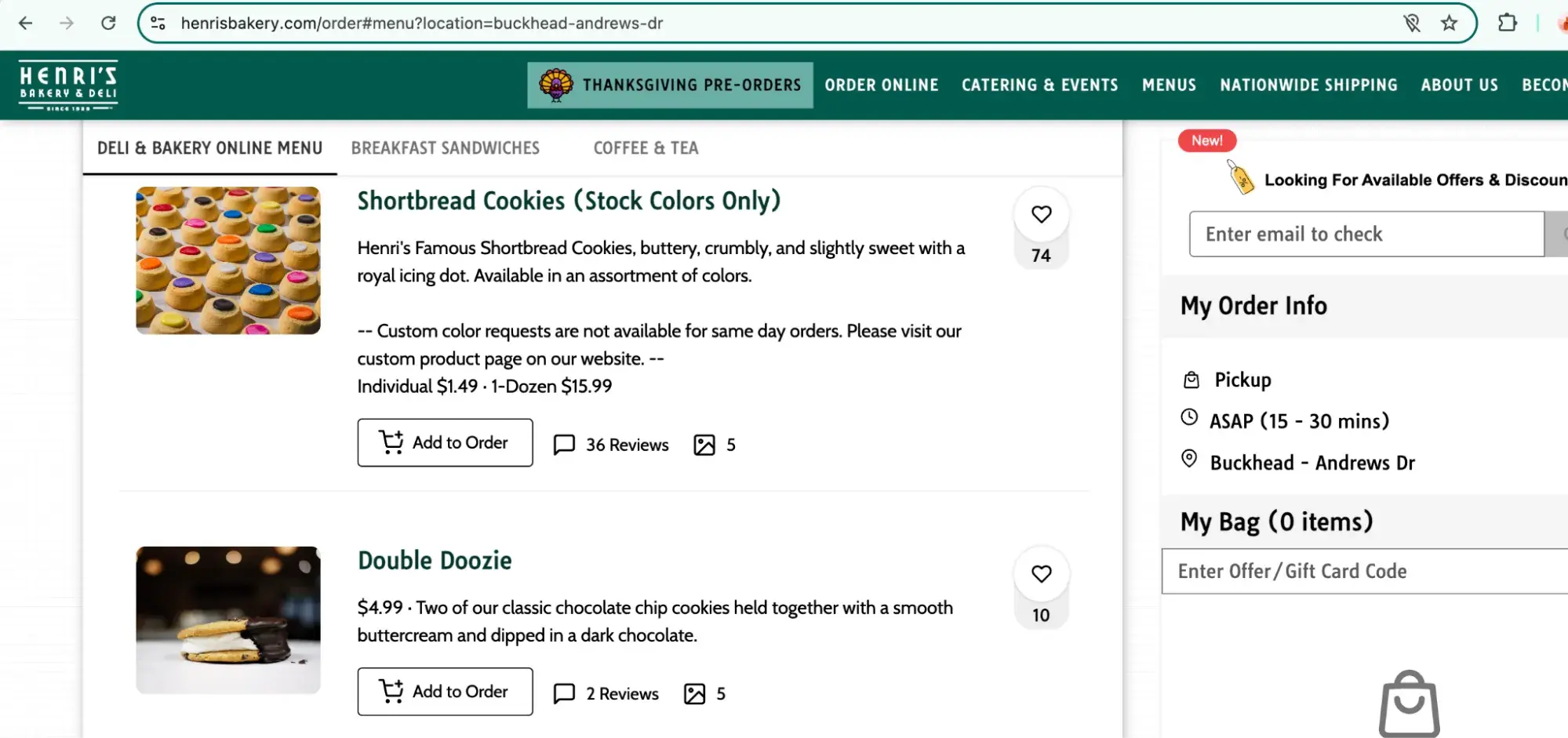 Established in 1929, Henri's Bakery has a website that combines old-school charm with modern web design practices. A full-screen hero image of its famous shortbread cookies draws in the eye.