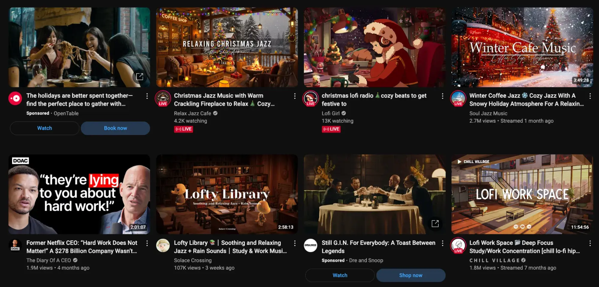 So, my hours watching the lo-fi girl results in dozens of recommendations for chill music.