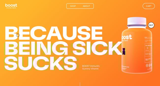 What we like: According to their site, BOOST is ¡°the first company dedicated to helping you get sick less.¡± It¡¯s a vitamins company with a brilliant website designed to hook you into that concept. Set against an orange gradient, the website focuses on a rotating bottle that follows you down the screen while highlighting its active ingredients.